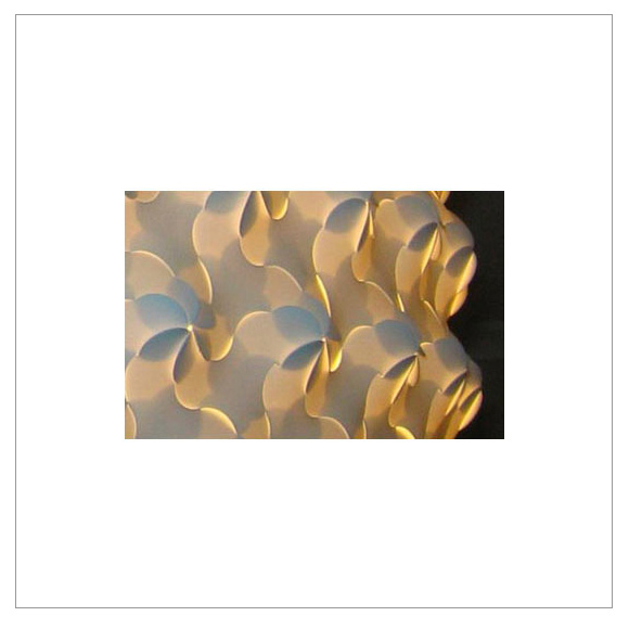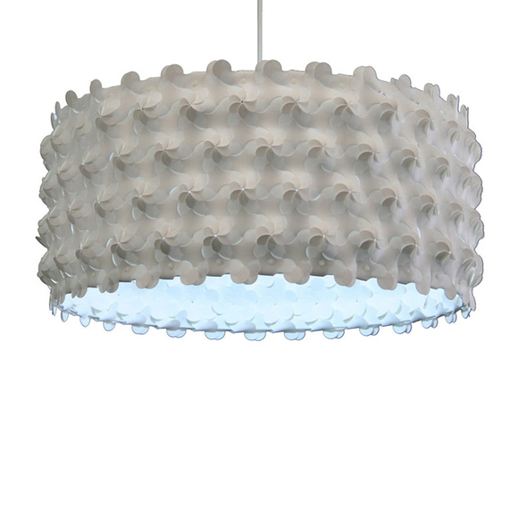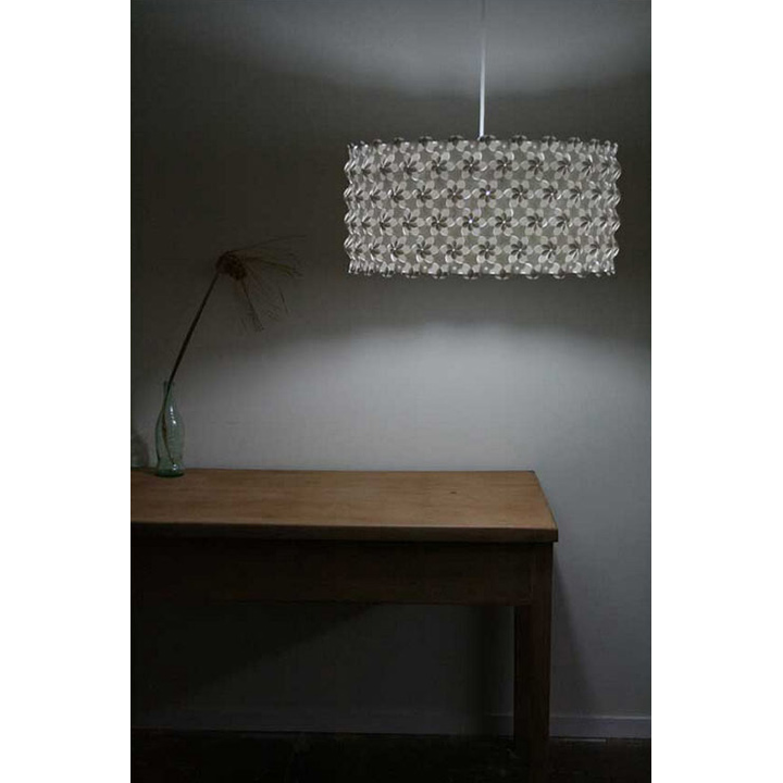 Switching the light on beautifully transforms the light shade and lights up the overlapping elements to show off what resembles an array of subtle frangipani flowers. The lamp is hand assembled using hundreds of interlocking petals. Bulb: 100 watt normal incandescent bulb or any CFL light bulb.