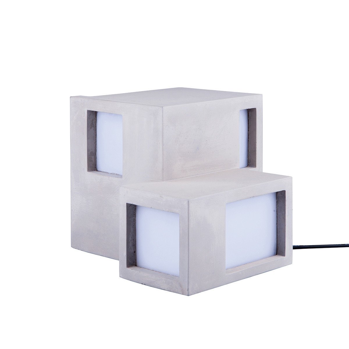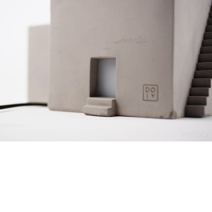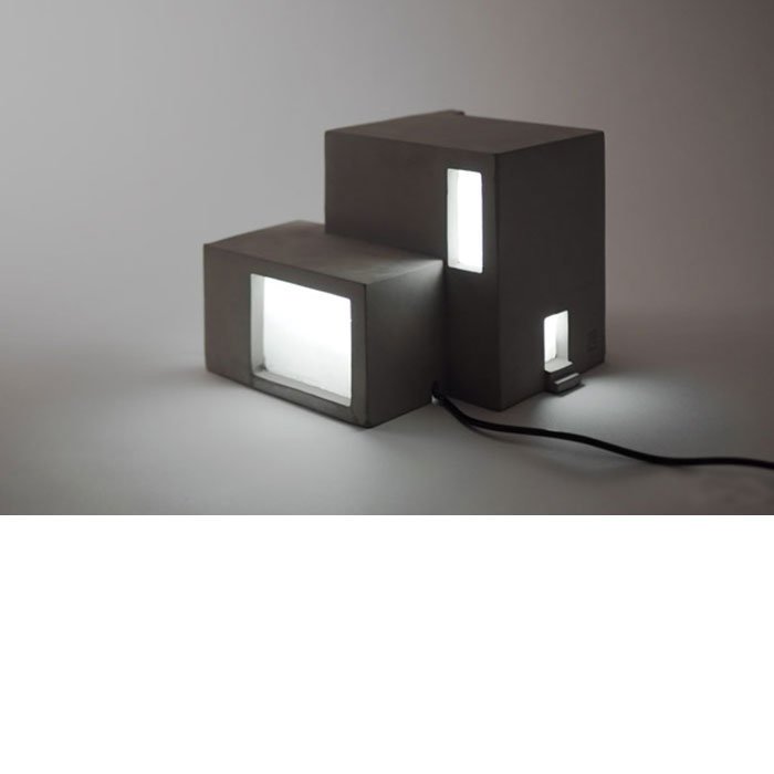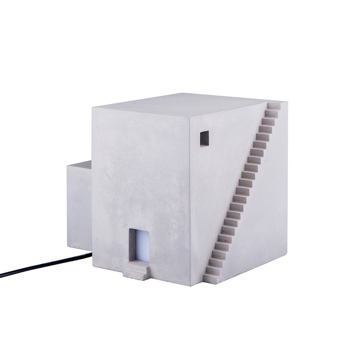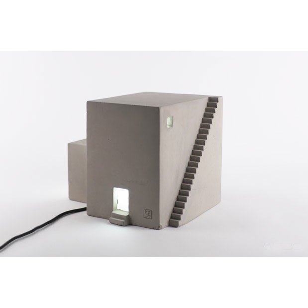 Archilamp is a cube-shaped concrete lamp with LED lit “windows” and a set of stairs to the “roof”. When lit up, light glows through the frosted windowpanes.