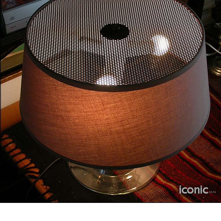 This beautiful creation is made from iron and glass. Brown shade and glass base.